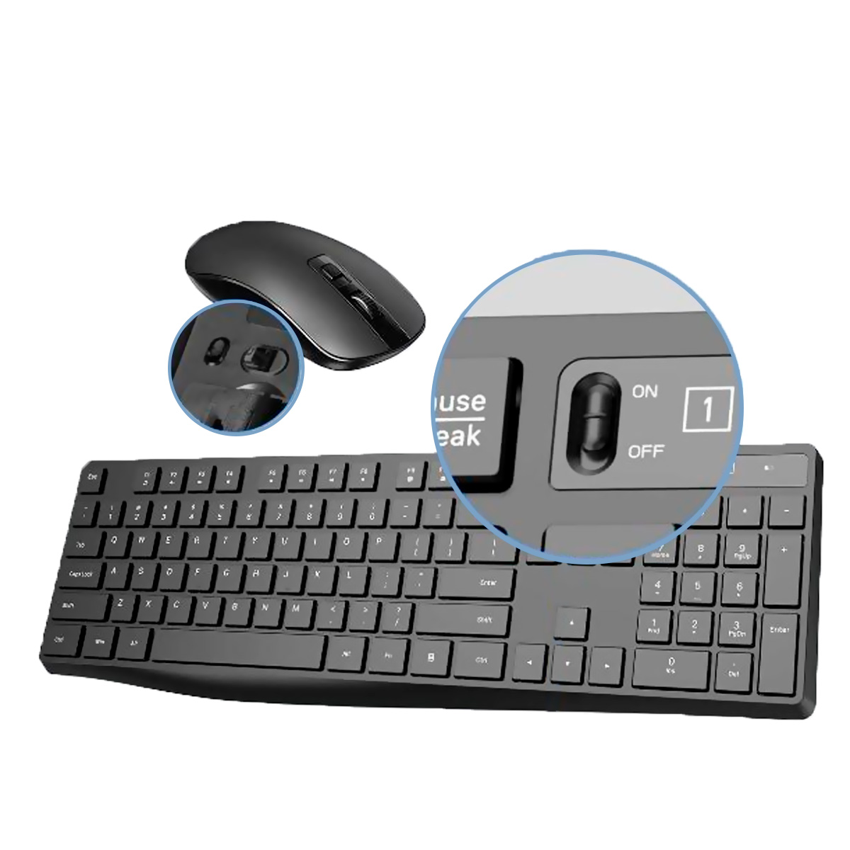 – Tanto el mouse como el teclado tienen un interruptor de encendido/apagado.