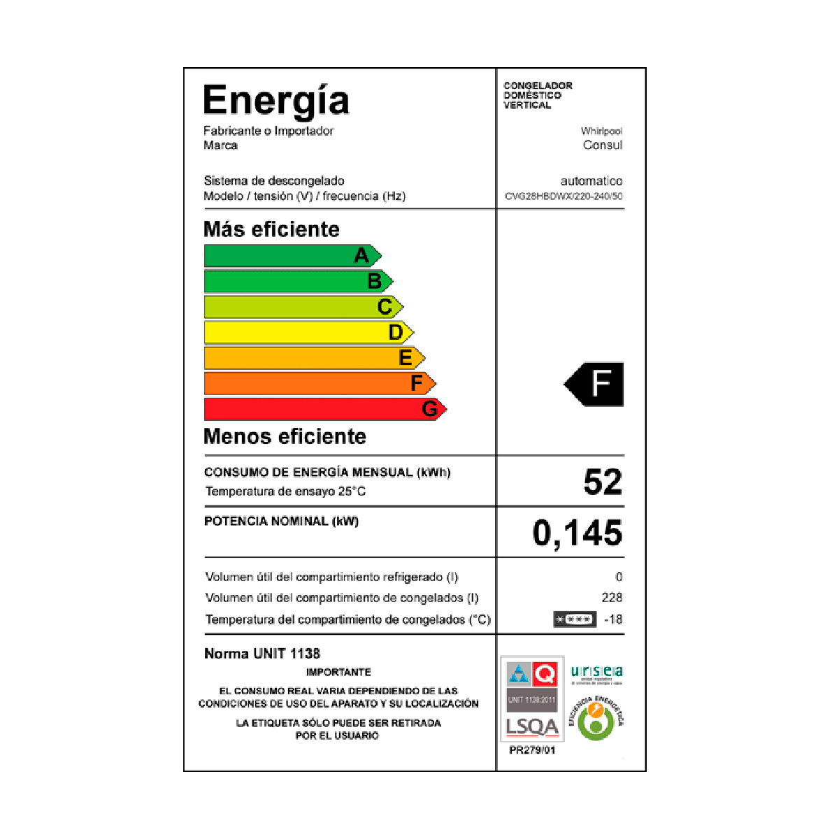 – Capacidad (neta): 280(L)