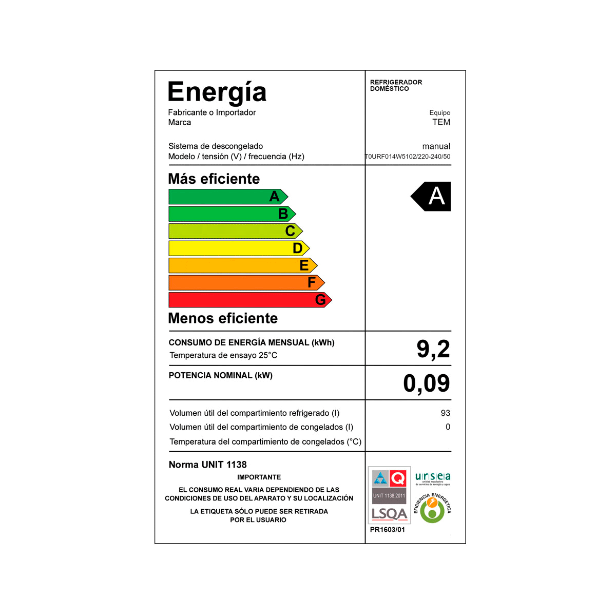 – Clase energética A, bajo consumo energético.