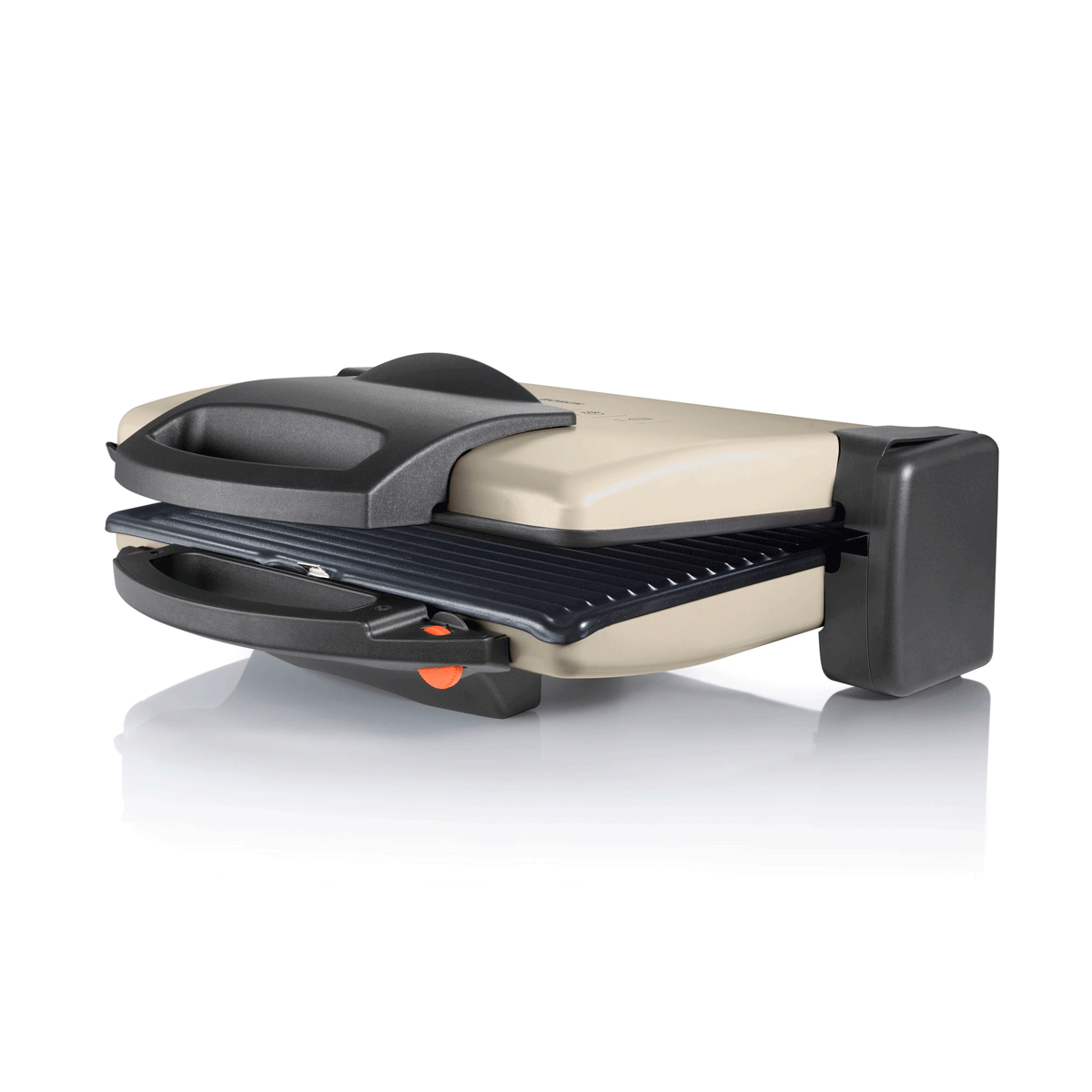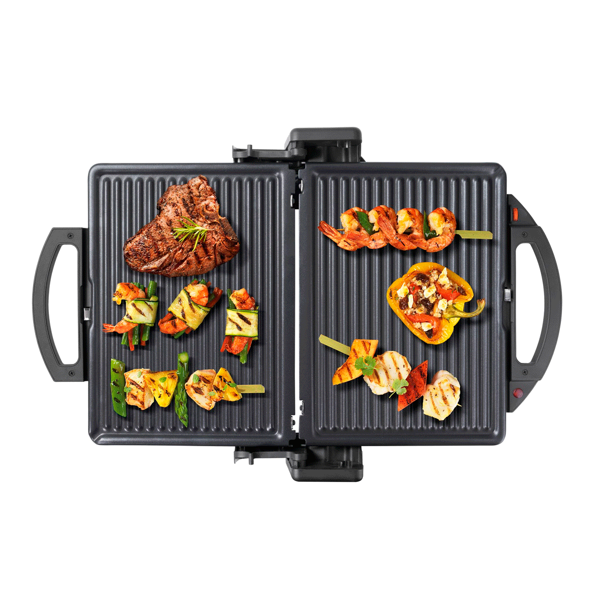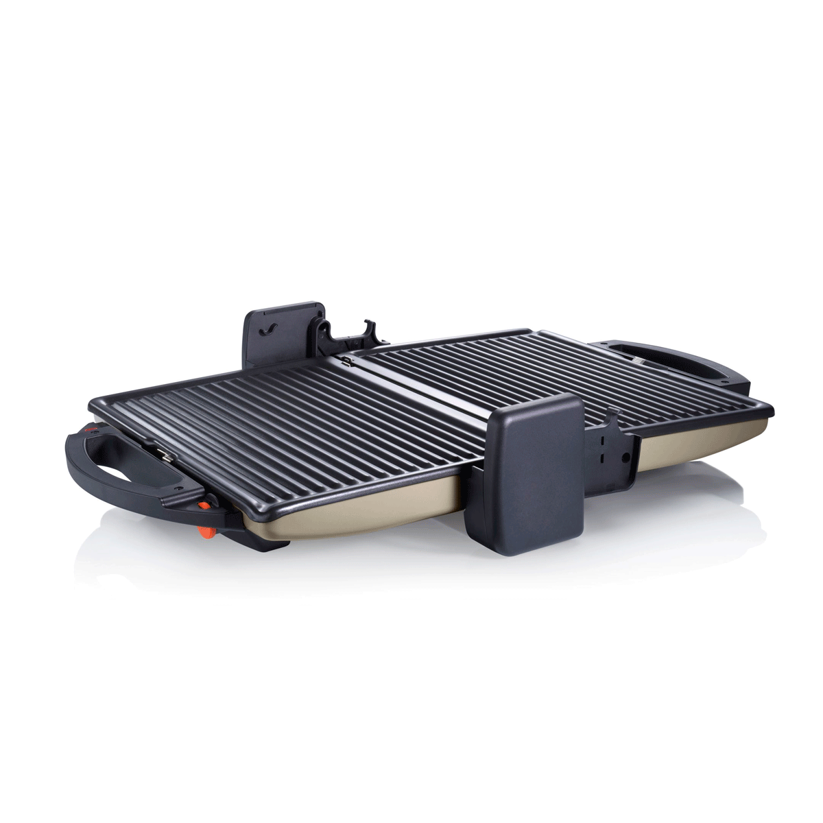 – Tres posiciones: cerrado como un grill, abierto como una plancha de asar o semiabierto para gratinar u hornear.