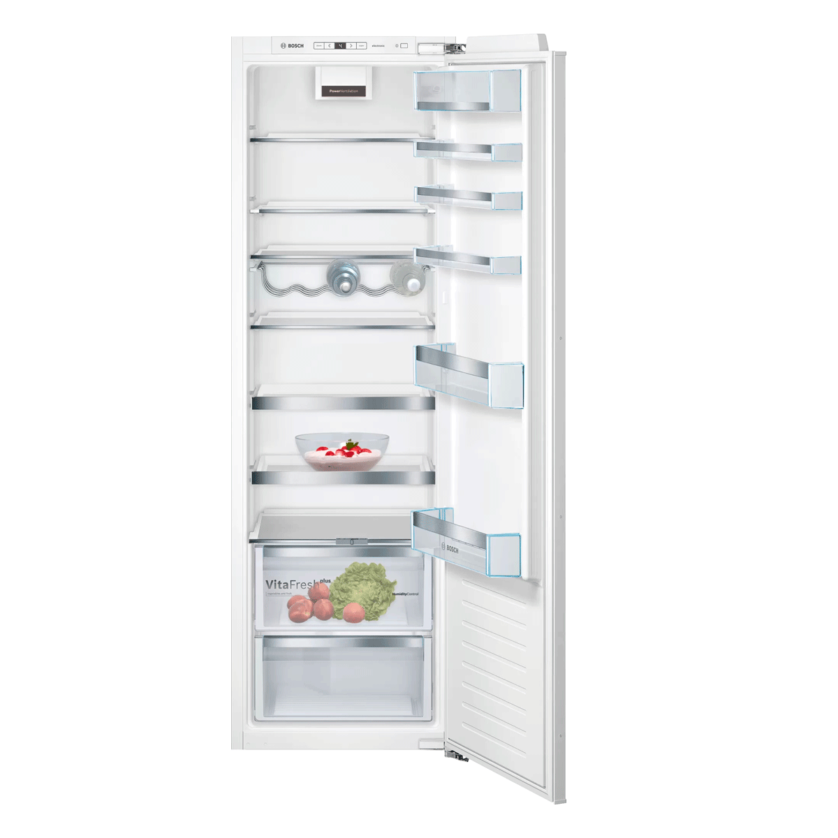 – Bandeja deslizante Vario: espacio adicional para botellas altas y grandes recipientes gracias a la bandeja flexible, que se puede separar y deslizar hacia abajo.