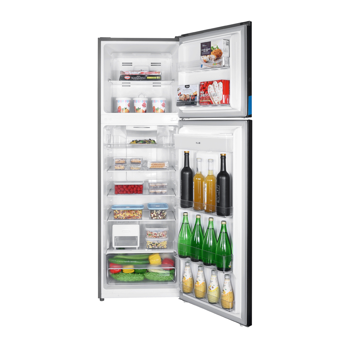 – Cajón transparente de frutas y verduras con control de humedad.