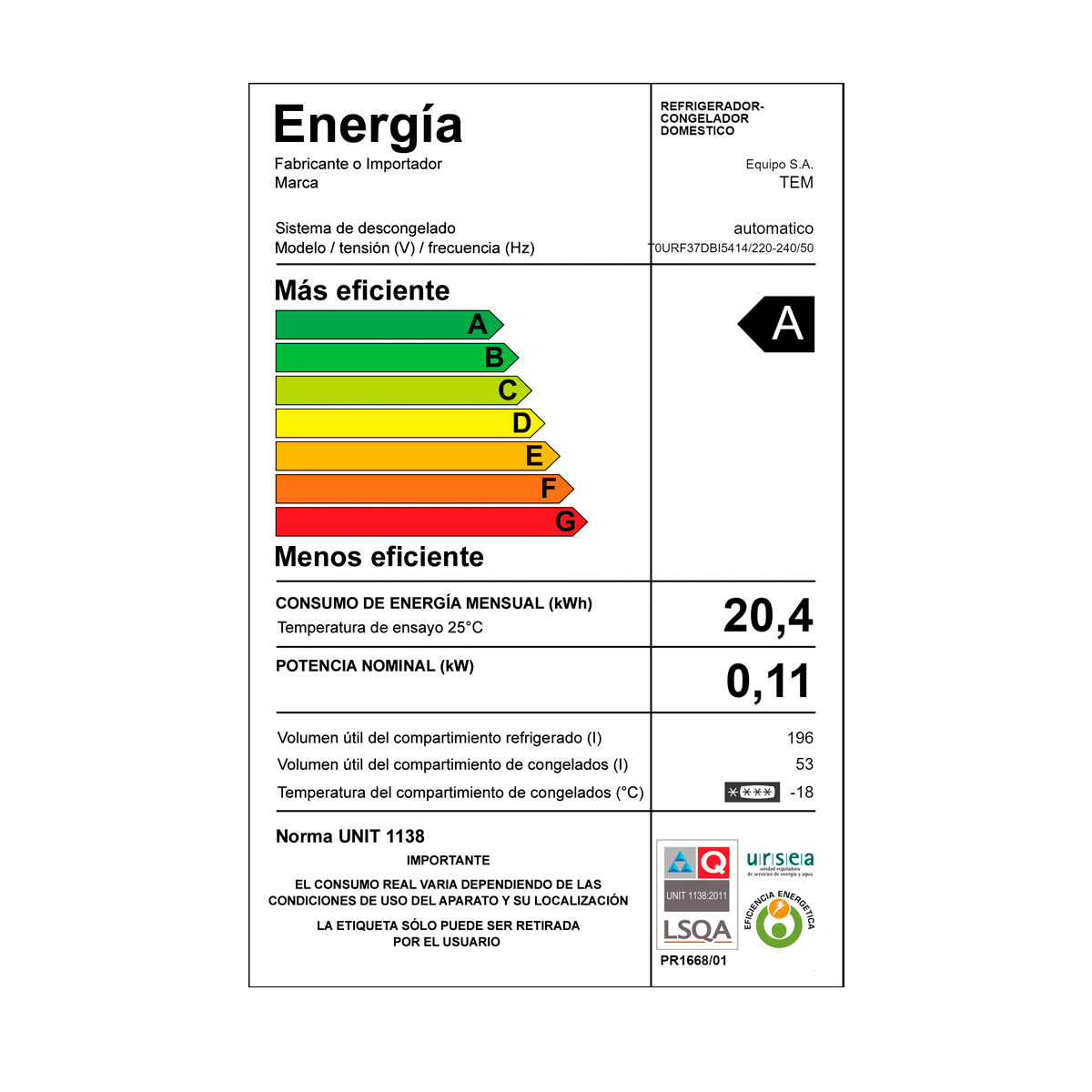 – CAPACIDAD: Refrigerador 198 Litros