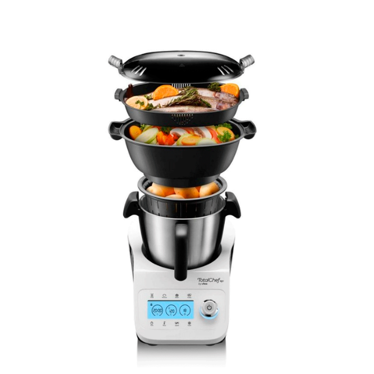 – Robot de cocina multifunción TotalChef RK3 con 30 funciones: rallar, calentar, cocer, sofreír, cocinar al vapor, picar, mezclar, amasar, picar hielo, trocear, batir, hervir, cocinar a baja temperatura, triturar, pulverizar, montar, mantener caliente, confitar, moler, rebanar, cocinar, remover, licuar, cocción lenta, cocción al baño maría, escalfar, función turbo, yogur y elaborar purés.